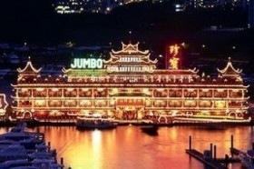 Schwebendes Dinner bei Sonnenuntergang auf dem "Jumbo Floating Restaurant".